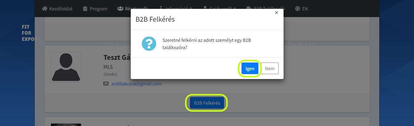 Ekkor a Résztvevő lista felületére érkezünk, ahol minden olyan résztvevő, akik feltöltötte a ZOOM felhasználónevét az adatlapjára, felkérhető a B2B felkérés gombbal egy találkozóra. (A hazai résztvevők, kérjük, hogy csak külföldi résztvevőket kérjenek fel.) A pop-up ablakban az Igen gombra kattintva elküldhetjük a felkérést, melyről a felkért fél emailben értesítést kap, valamint a saját B2B felületén is megjelenik.